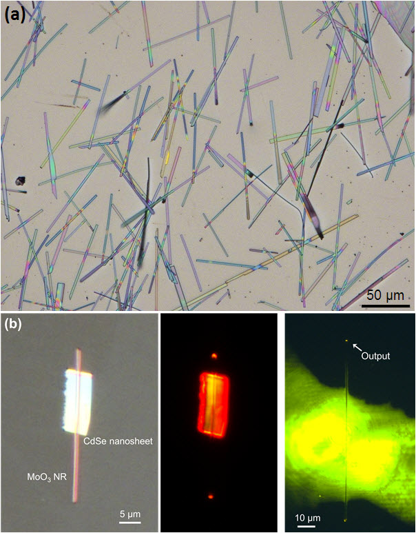 图:(a) 制备出的单晶MoO3纳米带;(b) MoO3纳米带与半导体材料及染料组成复合型F-P腔体。
