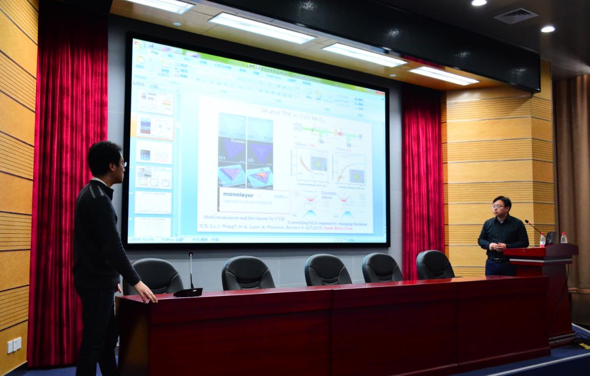 会议最后,在座师生就二维MoS2的制备、Z扫描测试系统的细节等问题同王俊研究员进行了深度探讨。最终,报告会在热烈掌声中圆满落幕。