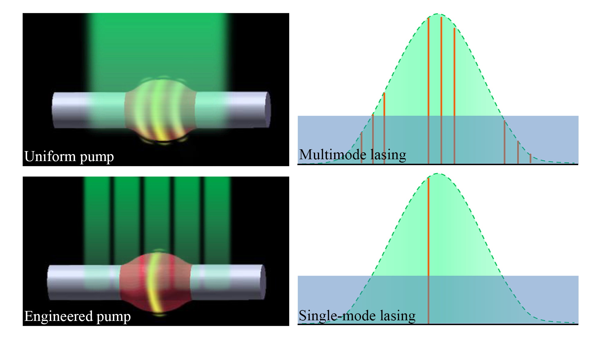 单模激光由于其高光束质量与及光谱纯度,在各学科和技术应用中至关重要。回音壁(WGM)微谐振腔由于其高品质因子和小模式体积的特点受到越来越多的关注,不同形状和材料制造的回音壁微腔在激光、传感和光通信等领域得到广泛研究。但由于缺乏模式选择策略,在WGM腔中产生的激光通常是多模的。近年来,扁长的瓶子形瓶子微腔(bottle microresonator)得到广泛关注,典型应用如光延迟线,腔体光力学和光频梳等。与其他形状的WGM腔相比(例如微盘和微球),其独特点在于其中不同模式的能量场会沿其长轴方向的空间分离距离很大,这使得可以根据其轴向模式分布选择一种所需的激光模式,从而抑制所有其它激光模式。