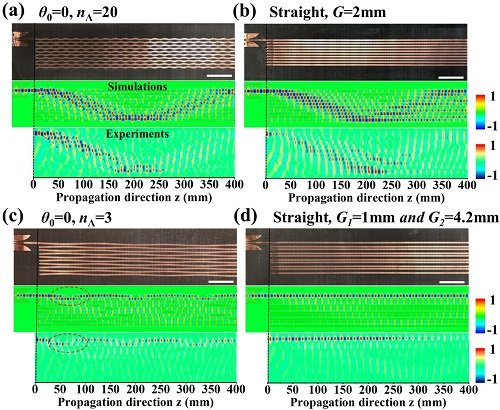 图一:(a) 高频驱动的周期性弯曲波导阵列与光场演化;(b) 均匀静态的波导阵列与光场演化;(c) Floquet波导阵列与光场演化;(d) 静态拓扑波导阵列与光场演化。
