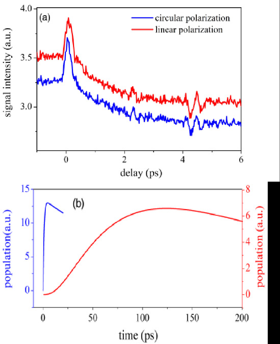 图4.(a)氮气分子337nm荧光信号随泵浦-探测脉冲延时的变化。(b)基于速率方程的数值模拟结果