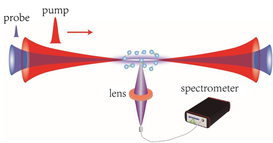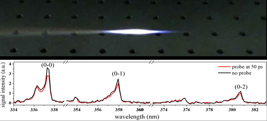 图3. 飞秒激光在空气中形成的等离子体(上图)。下图,在探测激光的作用下,氮气分子荧光强度受到损耗