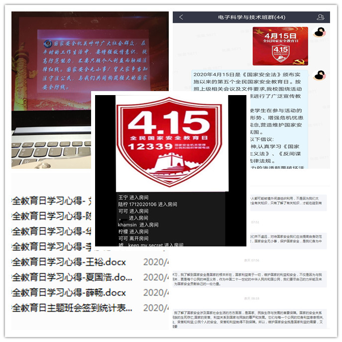 教育活动期间,各班分别在腾讯视频、钉钉、welink等软件上组织观看维护国家安全的主题教育视频。围绕《中华人民共和国反间谍法》、国家安全的定义和内涵、国家安全的重要性等主题开展专题学习交流。17级电子科学与技术班级向全校师生发出倡议:“一是倡议广大师生自觉从自身做起,注意防范日常生活中使用手机、网络泄密等内容,自觉履行维护国家安全的责任义务防范措施。二是检举国外机构或组织收买、策反、刺探、套取我国核心秘密等行为。”