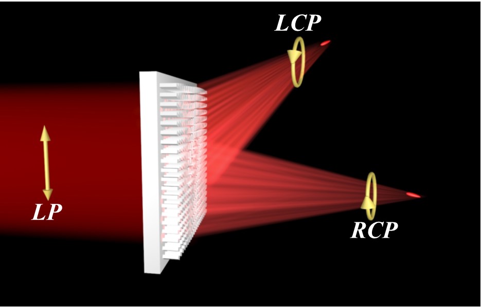 超表面作为一种二维超薄的超材料结构,具备尺寸超薄(大约波长的几十分之一),调制效率高、响应带宽大的特性和电磁波波前调控功能,使得其在太赫兹的振幅、相位和偏振操控和系统集成方面具有得天独厚的优势。发展基于超表面的超薄太赫兹波前调控器件可以有效的减小器件的厚度、体积,促进系统的小型化和集成化。近年来,几何超表面在全息成像、轨道角动量波束、超表面透镜、偏振转换器等方面取得了很多突出的研究成果。然而,几何超表面中的各项异性单元结构似乎“只能”实现对特定圆偏振态的电磁波实现波前调控,比如实现左旋圆偏振光的聚焦和右旋偏振光的散焦;导致目前大部分几何超表面透镜“只能”实现特定圆偏振态的聚焦,阻碍了其应用范围。