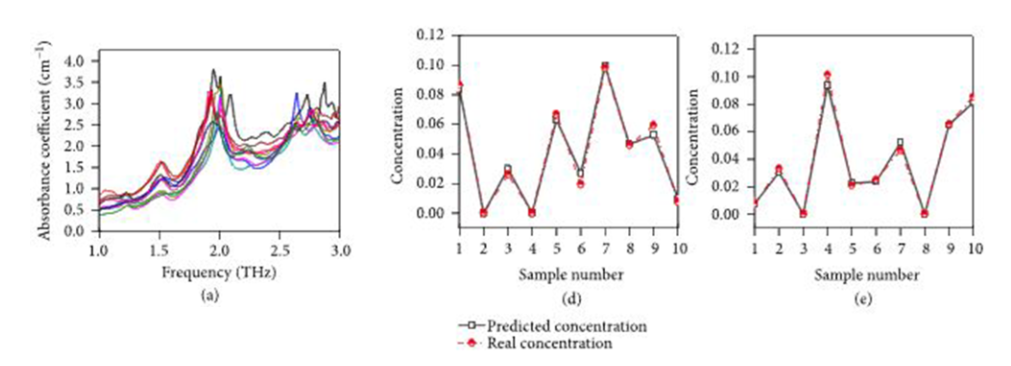 在检测进展方面,若需要对癌症的种类和发展阶段做到精准识别,则需要通过检测癌症组织中标志物的含量。基于太赫兹光谱技术,科学家们能通过识别混合物光谱中目标物特征峰来推断混合物中目标物的含量。由于部分癌症的标志物在太赫兹波段也存在独特的特征峰,因此可以通过太赫兹光谱技术对标志物进行定性定量检测。2018年,由b体育sports官方网站彭滟等人对混合物中脑胶质瘤特异性物质的定量分析,其样本由两种脑胶质瘤特异性物质和5种脑组织主要成分组成,如图所示,通过太赫兹光谱系统获取了样本的太赫兹光谱,并结合支持向量回归算法推测出了样本中两种脑胶质瘤特异性物质的具体含量,准确率高达99%。