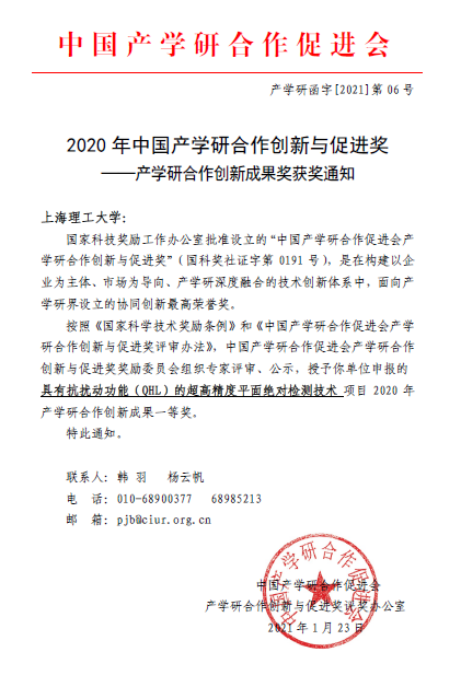 1月23日中国产学研合作促进会【产学研函字(2021)第06号】发布通知。经中国产学研合作创新与促进会组织专家对项目进行评审,我校光电信息与计算机工程学院庄松林院士领衔、韩森教授团队攻关的“具有抗扰动功能(QHL)的超高精度平面绝对检测技术”项目荣获2020年中国产学研合作创新成果一等奖。