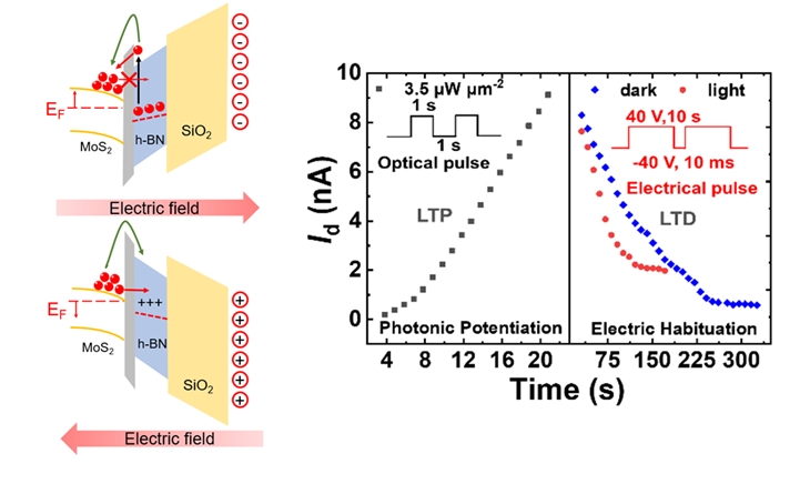 该研究首先发现MoS2/h-BN和Graphene/h-BN场效应晶体管有相似的光致掺杂行为,同时在MoS2/h-BN的转移特性曲线中未发现明显的迟滞现象,说明光致掺杂与MoS2沟道内的缺陷或杂质的光生载流子俘获无关,而是来源于h-BN栅层内缺陷能级的光激发。进一步与MoS2/SiO2对比发现,MoS2/h-BN场效应晶体管的光致掺杂表现出良好的非挥发性,而MoS2/SiO2器件的光致掺杂不能长时间维持。将这一差异归结为MoS2和h-BN之间存在一薄层范德华势垒。这一范德华势垒不仅使光致掺杂获得非挥发性,还使其能够受栅压和光照调控。在系统分析了MoS2/h-BN场效应晶体管的光致掺杂效应之后,研究人员对其作为突触地行为进行了表征,着重指出其长期抑制行为可以被光照和栅压联合调控。本项研究还对实现具有存储和逻辑功能的光电探测器有借鉴意义。