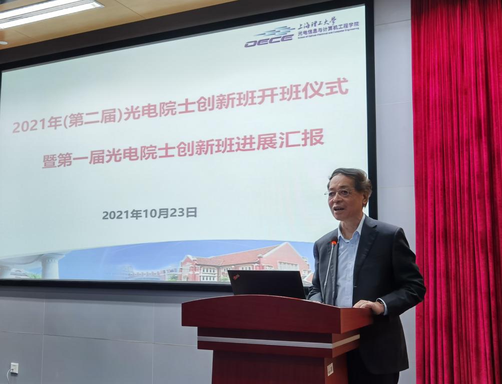 杨晖介绍了第一届“院士创新班”同学在竞赛中获得的骄人成绩,几乎每一位院士班的同学都能够在这一年中学有所获,学有所成。杨赞等老师介绍了新一期“院士创新班”培养方案和规划养成道路,同时对同学们提出了新要求。与会教师代表逐一发言,向同学们介绍了各自的研究方向、擅长领域,以及近年来在指导学生参赛方面取得的成绩。对于“新鲜血液”的加入,老师们表示由衷欢迎,同时鼓励同学们多多表达自己的想法,通过交流,碰撞出思想的火花。第一届“院士创新班”优秀学员代表王嘉栋、黄敏、马俊杰几位同学分享了过去一年里在参加科研竞赛、工作实习经历、思想成长变化等方面的收获与感悟。通过新老学员的充分交流,新学员们纷纷表示,要像庄院士和优秀的学长学姐看齐,以院士创新班这一平台为起点,追寻科学之光,在学术和科研上砥砺奋进、勇攀高峰,发挥光电学子“光”和热。