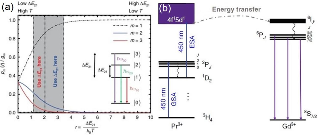 三激发能级玻尔兹曼型荧光温度测量模型和Pr3+ → Gd3+紫外上转换发光示意图