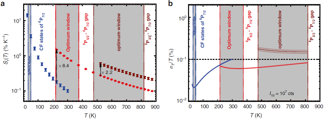 科研人员用燃烧法合成了YAl3(BO3)4: Pr3+, Gd3+发光粉,其在450 nm蓝光激发Pr3+作用下,高效上转换发射紫外光(~290-320 nm)。这些紫外光来自于Gd3+激活离子6PJ激发态能级到基态8S7/2能级的辐射跃迁。科研人员创造性地基于Gd3+ 6PJ能级的晶体场分裂能级和自旋轨道分裂能级来构建三激发能级玻尔兹曼模型,实验例证了上述三能级玻尔兹曼温度响应模型,实现了30到800 K极宽温度变化范围内的精确测量:在30K时,其相对灵敏度高达11.6% K-1,远高于常规的1% K-1阈值要求;同时在所有温区窗口,都可实现不确定性小于0.2%的高精度温度测量。需特别指出的是,这种蓝光 → 紫外上转换荧光粉材料很容易被价格低廉且功率强大的450 nm蓝色LED激发;其激发和发射波段可有效避免最高温度下黑体辐射影响,实现了零背景发光测温,在纳米医疗、新型光电子器件等领域具有极大的实际应用价值。