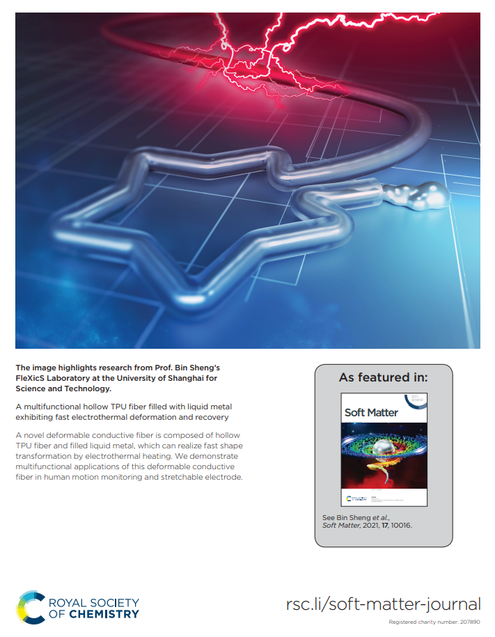 柔性导电纤维在柔性电子领域备受关注,制造一种可快速变形兼具大拉伸范围的多功能导电纤维是该领域的研究热点。近些年,b体育sports官方网站庄松林院士超精密光学制造团队盛斌副教授领导的柔性器件研究小组专注于柔性光/电器件的制备和应用,取得一系列研究成果。该论文近期作为封面论文在国际软物质权威期刊《Soft Matter》上发表,RSC英国皇家化学会重点推介了这项研究成果。2019级硕士研究生熊岩同学为第一作者,盛斌副教授为通讯作者。