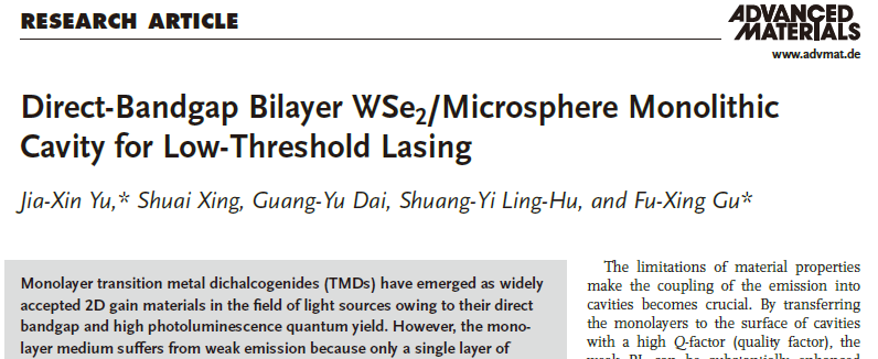 近日,庄松林院士领衔的未来光学实验室、谷付星教授课题组在国际顶级期刊Advanced Materials(影响因子30.849)上发表了题为“用于低阈值激光的直接带隙双层硒化钨(WSe2)/微球一体腔”(”Direct-Bandgap Bilayer WSe2/Microsphere Monolithic Cavity for Low-Threshold Lasing”)的研究成果。该论文由谷付星教授和于佳鑫副教授为共同通讯作者,于佳鑫副教授与博士生邢帅为并列第一作者。该研究工作的方案设计、实验、模拟工作均在b体育sports官方网站未来光学实验室完成。