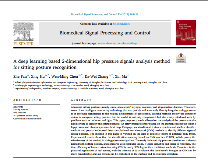 此外,本文的第三作者范哲为b体育sports官方网站2018级电子信息工程专业本科生。此前,范哲同学以第一作者身份在生物医学领域SCI期刊《生物医学信号处理与控制》《Biomedical Signal Processing and Control》(IF:3.88;JCR:Q2)上发表论文“基于深度学习的二维臀部压力信号分析的坐姿识别 A deep learning based 2-dimensional hip pressure signals analysis method for sitting posture recognition”。该论文的指导教师为胡兴副教授和张大伟教授。该项研究与复旦大学以及中山医院进行合作,论文以实验室生成的人体坐姿臀部压力分布数据作为数据基础,提出了一种基于臀部界面压力分析的坐姿识别方法。范哲同学采用传统的特征提取和浅分类器方法,以及卷积神经网络(CNN)方法来识别不同类型的坐姿。实验结果表明,基于CNN的分类准确率达到99.82%,证明了该方法在坐姿识别中的有效性。研究表明,臀部压力分布与坐姿密切相关,相较于传统视觉检测,受干扰较小,更容易识别。同时,在未使用GPU加速的情况下,使用CNN进行特征提取的时间效率就已经比传统方法提高了近30%。该篇论文提出的这种快速准确识别不规则坐姿的智能监测技术,对青少年的健康发展具有深远的意义。
