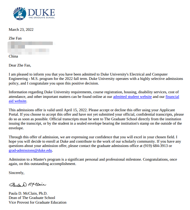 范哲同学大三时基于自身对于深度学习领域的强烈兴趣,主动进入张大伟教授团队实验室学习,在胡兴老师的指导下,他完成了诸多实验,科研思维以及代码能力也得到全方位的提升。此外,范哲同学还有两篇SCI论文(分别为一作和二作)正在审稿之中。他也以第一作者身份拥有已进入实质审核阶段的发明专利一项,同时获得过全国大学生数学建模竞赛本科组上海市二等奖等诸多奖项。目前,范哲同学已被美国杜克大学普莱特工程学院(Pratt School of Engineering)录取为硕士研究生,并被评为2022年度上海市优秀毕业生。