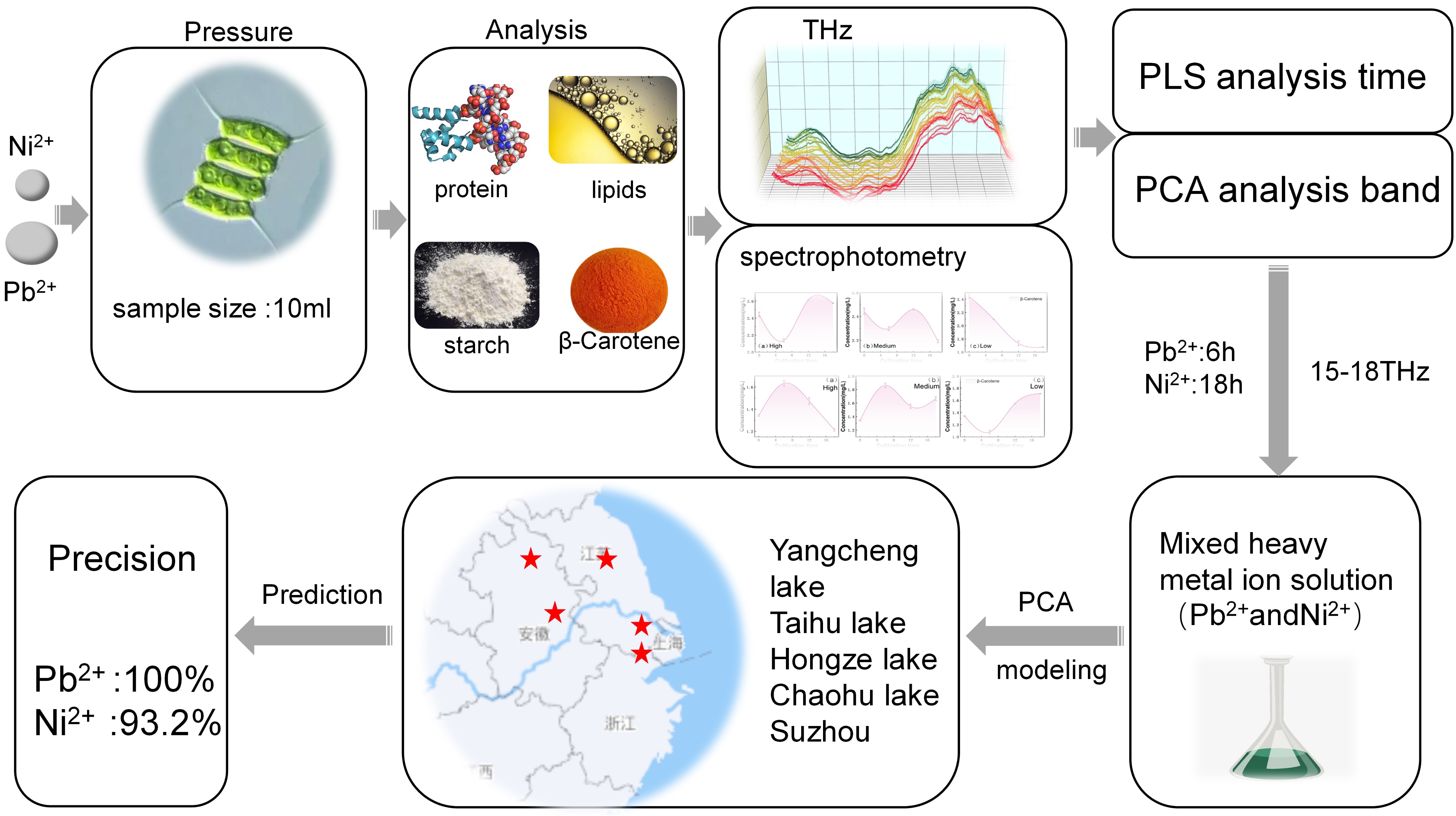 与传统重金属检测方法相比,本文提出的 以微藻为载体结合太赫兹技术的方法不需要复杂的预处理,样本量仅需10 ml,检测精度提高至0.001 mg/L,为水体重金属的种类和浓度检测提供了新的技术支撑。研究的优势在于原位、快速、对环境无污染,有利于实时监控水体污染情况,同时能起到通过微藻净化水体的效果,为完善水体重金属的检测提供了新的检测思路和方法。