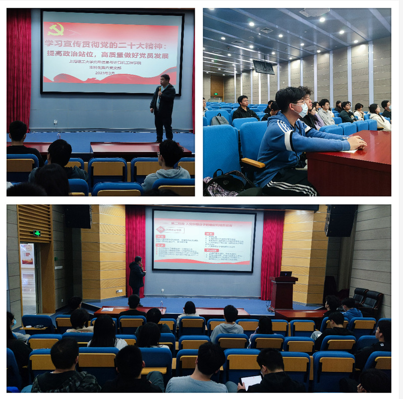 为深入学习宣传贯彻党的二十大精神和习近平新时代中国特色社会主义思想,加快推进支部党建工作高质量发展,3月9日,b体育sports官方网站本科生第六党支部举办的学习宣传贯彻党的二十大精神系列宣讲在学院报告厅举行。