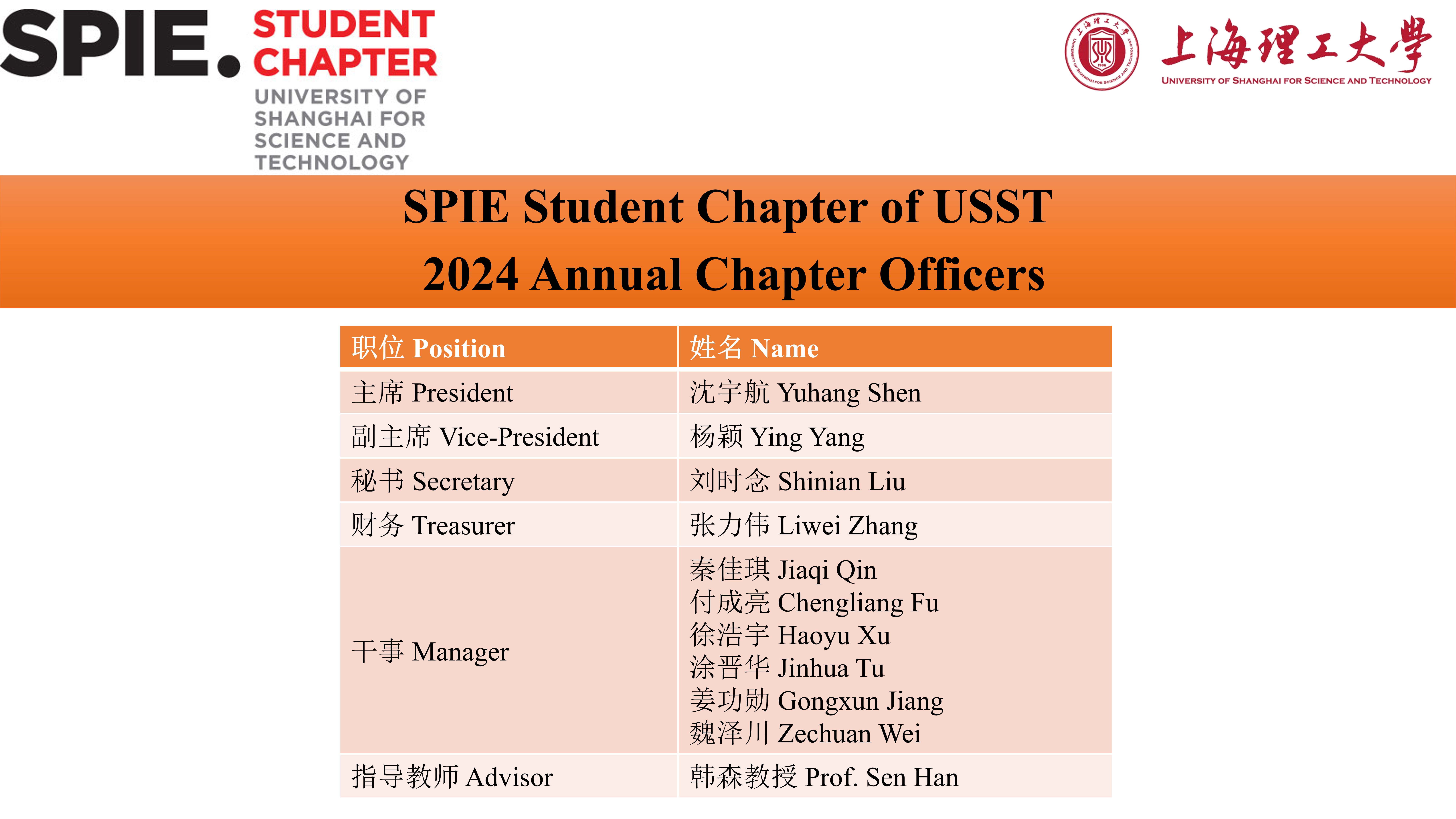 国际光学工程学会b体育sports官方网站学生分会(SPIE Student Chapter of USST) 是b体育sports官方网站韩森教授于2014年10月发起成立,致力于建设学生与国际接轨的学术交流平台,成员由b体育sports官方网站光学工程及相关专业的博士、硕士及本科生组成,现任主席为博士研究生沈宇航同学。