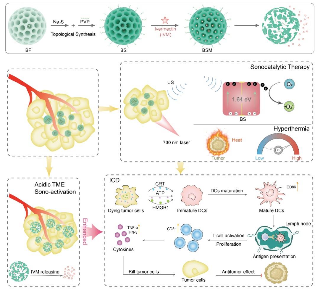 近日,b体育sports官方网站庄松林院士、张大伟教授领导的超精密光学制造创新团队通过拓扑合成策略将宽带隙的氟化铋纳米材料调控为一种窄带隙的硫掺杂氧化铋纳米材料,用于免疫原性细胞死亡介导的肿瘤免疫治疗。研究结果表明,超声刺激下硫掺杂氧化铋纳米材料具有更高的电子-空穴分离效率,可以产生更多的活性氧物种;硫元素的掺杂能够扩展其光吸收范围,使其在730纳米的光照下具有良好的光热转换性能;释放的铋离子将会与肿瘤微环境中过表达的谷胱甘肽反应,放大肿瘤细胞的氧化应激;利用其介孔结构装载伊维菌素药物,进一步增强肿瘤细胞的免疫原性死亡,最终实现更加有效的免疫应答。