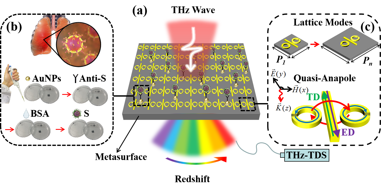 在太赫兹波段,大分子蛋白质等有直接的特征吸收,这是因为分子间化学键,比如范德华键、氢键的振动能级落在太赫兹波段。超表面免疫传感器是生物传感器的一个重要分支,当超表面结构上预先制备特定生物分子抗体时,就形成了一种免疫传感器,其能够高效的吸附相应抗原分子,实现高灵敏度与特异性的太赫兹生物蛋白检测。然而,之前设计的超表面结构存在辐射损耗大,灵敏度低等问题。在物理学中,Anapole模式由于远场观测到的电偶极子和磁偶极子具有等幅反相的特征,对辐射损耗起到了一定的抑制作用。太赫兹技术创新团队联合新加坡南洋理工大学Thomas Tan CaiWei博士和Ranjan Singh教授,提出了一种用于SARS-CoV-2刺突蛋白的特异性检测的高灵敏太赫兹超表面免疫传感器。上海科源电子科技有限公司袁旭军总经理和上海市疾控中心的张曦主任也参与了SARS-CoV-2蛋白的讨论。本工作在设计Anapole模式超表面的基础上,利用Lattice模式对其进行调制,利用超表面周期结构中的非辐射瑞利散射,进一步抑制辐射损耗,将免疫传感器的Q值优化到89,FOM达到26.7。研究人员利用金纳米颗粒与SARS-CoV-2蛋白抗体对该超表面进行生物修饰,制备了一种具有特异性的SARS-CoV-2免疫传感器,当抗体浓度为50 pg/mL时,检测极限达到3 pg/mL(39 fmol)。实验结果还表明,免疫传感器的检测下限与表面修饰的抗体浓度密切相关。该项工作为高灵敏度和特异性生物分子免疫传感器的设计提供了新的解决方案,在太赫兹生物医学领域有潜在的应用价值。