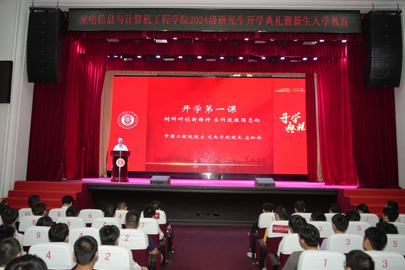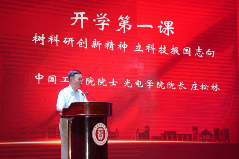 上午9时,伴随着庄严的国歌声,典礼正式拉开帷幕。首先,庄松林院士以“树科研创新精神,立科技报国志向”为题为同学们讲授开学第一课。他通过讲述自身的科研奋斗经历向全体研究生新生提出了将个人梦融入中国梦的倡议。他谈到,当代青年应响应国家和时代召唤,勇于承担时代责任,秉持坚定的信念和正确的人生价值观,立志为国家富强、社会进步和人民幸福而努力读书、奉献自我。他勉励光电学子要潜心求学、砥砺奋进,脚踏实地、心比天高,坚持耕耘、成就梦想。