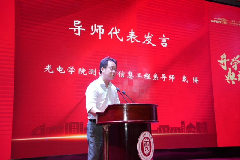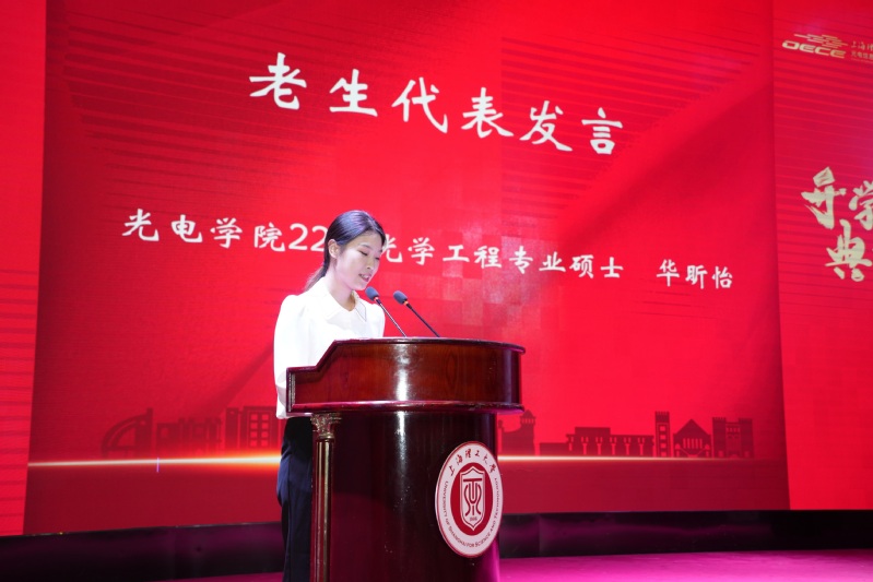 学院测试与信息工程系教师、上海市五四青年奖章获得者戴博作为导师代表发言,他谈到,近年来学院着力打造的师生共同体、科创联合体和行业协作体为同学们提供了良好的学术科研环境和平台。作为新一届研究生,从今天开始,同学们前行的道路上将面临新的坎坷和挑战,这段旅途将充满未知、充满挑战,但也将充满机会和成长。这不仅是一条充满未知与艰辛的求学之路,也是一条实现远大理想的自我之路。只要同学们积极探索,在坚持不懈中守正创新,必定攀登上属于大家的科研高峰!
