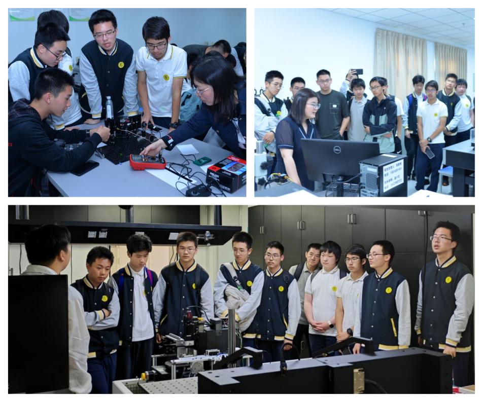下午,科技节活动接待了上海市控江中学“致海书院”学生研学实践活动。同学们聆听了《追光一甲子,拳拳报国心》未来光学科学家精神报告和《光的波粒传奇——从微粒波动之争到太赫兹技术前沿》科普讲座后,进入本科实验教学中心。在韩朝霞老师的带领下,他们初识光谱技术,用光学元件搭建简易的扫描式光谱仪,直观认识了光谱仪的组成和原理,并观察到七色光谱。温小红老师展示的生物芯片检测实验,通过沉浸式操作体验,让同学们了解到生物传感器在老年疾病早筛和动态监测中的关键作用。随后,同学们来到b体育sports官方网站太赫兹技术创新研究院,参观了研究生们正在进行的科研项目:太赫兹探测器、太赫兹超透镜、太赫兹人体安检仪、太赫兹近场扫描显微镜等。他们认真听讲、积极提问思维的火花在交流中不断碰撞。