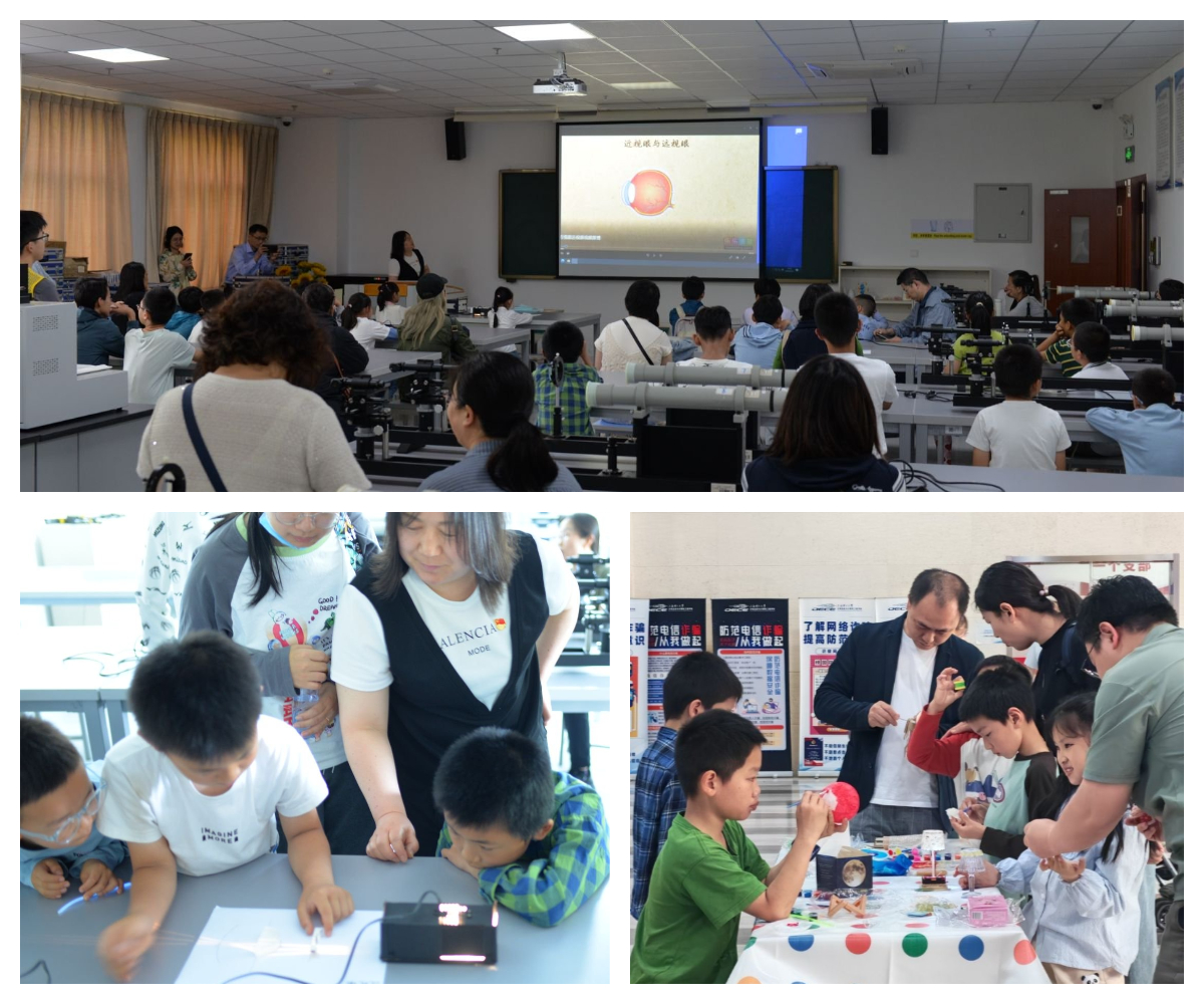 在光电信息实验中心教师志愿者的引导下,大家有序参观了本科实验教学中心。在方宝英老师的指导下,小朋友们进行了《近视眼和远视眼的形成及其矫正》光学趣味小实验。小朋友们兴致勃勃地亲手摆弄着光学元件,像一个个小科学家,认真模拟着近视眼成像的模糊场景,以及佩戴眼镜后清晰视物的奇妙变化。在这个过程中,他们不仅轻松理解了光学矫正的原理,更在心底种下了爱护眼睛的种子,深刻意识到保护视力的重要性。此外,“显微镜”“潜望镜”“投影灯”“台灯”等生活中常见物品的光学原理探究活动,小朋友们自己组装,直观感受到光学反射、折射原理在日常生活中的应用,锻炼了动手能力和创造力,深刻体会到了“科技让生活更美好”的真谛。