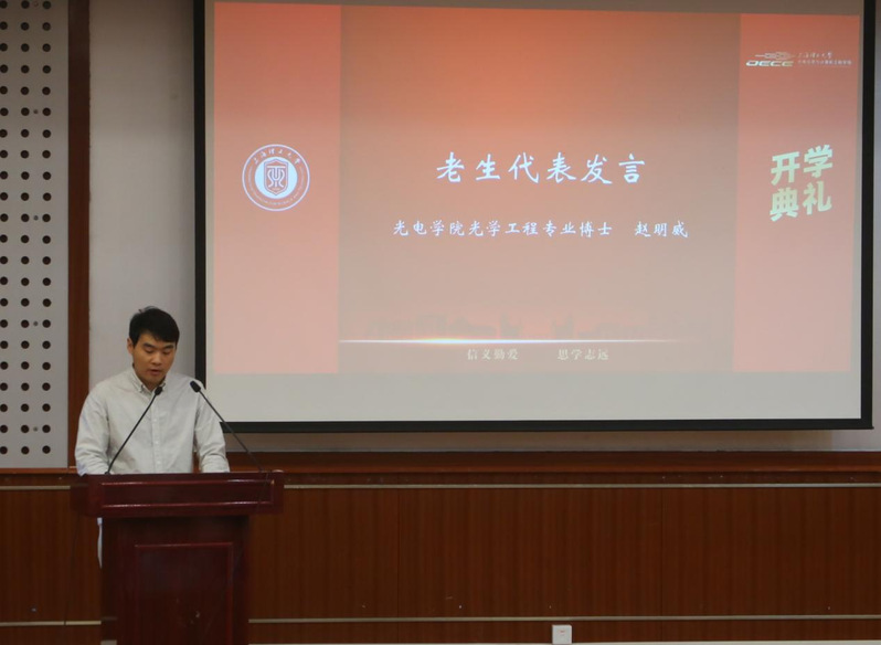 开学典礼在庄严的国歌声中拉开帷幕。副校长张众代表学校向新生致以热烈欢迎和祝贺。在以题为“踏实科研路,求真务实心”的寄语中,他精辟而深刻地指出:第一,要立鸿鹄之志,勇于挑战科学前沿;第二,要恪守学术道德,坚守求真务实的科学精神;第三,要注重交叉融合,在协作中开拓创新。他鼓励同学们始终保持理性思辨与实证精神,不畏艰难、实事求是,用严谨的实验和缜密的逻辑直面挑战。
