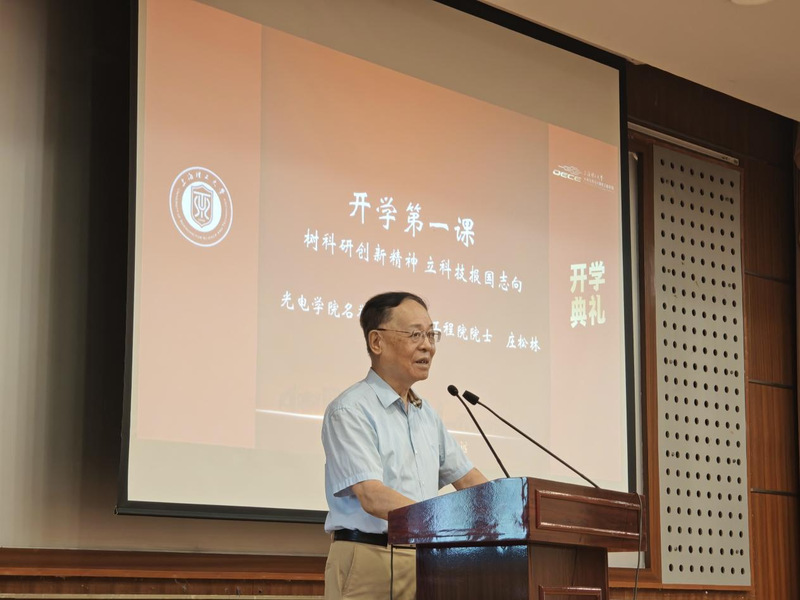 中国工程院院士、学院名誉院长庄松林以“最美的科研誓言就是爱党爱国”为题,为新生讲授《开学第一课》。他回顾了自己从艰苦求学至海外归国的科研历程,分享了对科学事业的热爱与对祖国的深厚情感。庄院士感慨道,“再困难的时期,我都没有停止读书和思考”。他鼓励打破单一学科局限,主动从人类文明中汲取营养,培养跨界思维方式,融合科学精神与人文情怀,以拓宽科研道路。他勉励光电学子既要脚踏实地夯实基础,更要志存高远、抬头看路,以开放心态迎接挑战,以坚韧意志和使命成就梦想。