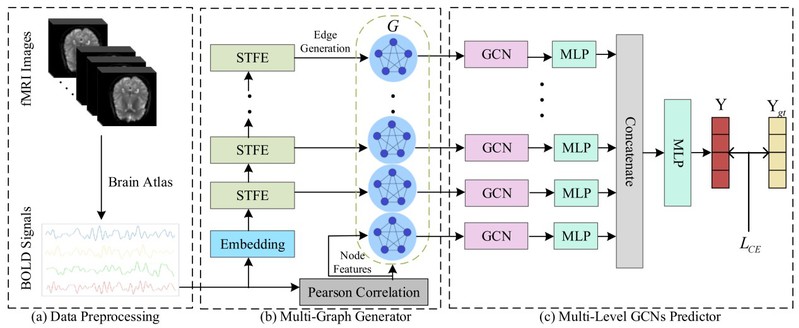 阿尔茨海默症(AD)是一种常见且不可逆的神经退行性疾病,早期精准识别与诊断对延缓疾病进程、提升患者生活质量具有重要意义。当前,基于静息态功能磁共振成像(rs-fMRI)的脑网络分析已成为阿尔茨海默症早期识别的关键研究方向,但受限于rs-fMRI数据低信噪比和脑网络结构复杂等问题,传统机器方法和早期深度学习模型难以实现高效、准确的特征提取与疾病预测。